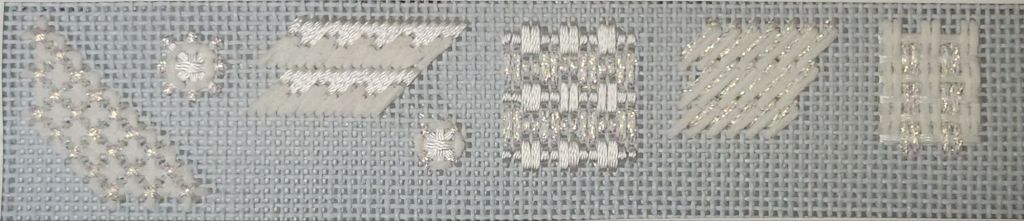 Using Neon Rays N02, Petite Very Velvet V602, and Crystal Braid CR01, I stitched from left to right: Double Straight Cross Stitch, large Tied Double Cross, Slanted Beaty Stitch, small Tied Double Cross, Double Parisian Stitch, Diagonal Brick, and Burden Stitch. I hadn’t seen the Tied Double Crosses (different threads would be better) or a Diagonal Brick before (offset rather than rows would be nice to try too).