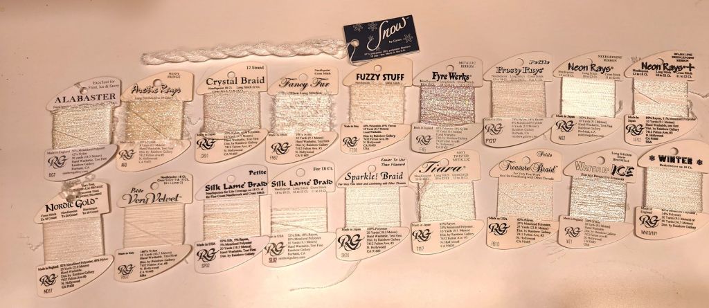 Ellen of Serendipity Needleworks had a 3-hour Zoom class on thread and stitch choices for winter/snow scenes recently.