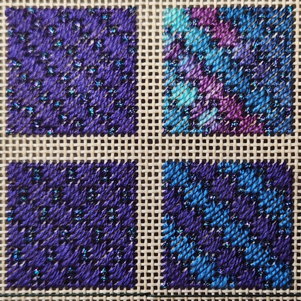 So, I tried the Stardust Stitch. Compensation is tough! I tried it with Wildflowers, an overdyed thread, and Kreink (upper right corner), all solid Impressions with Kreinik (upper left), and two solids, Impressions and Perle #8 with Kreinik (bottom right). Then, just to see the differences, I did the Souffle in solid Impressions with Kreink (bottom left). Souffle is easier to compensate but not by much. They share the same basic pattern but the relationship to the previous row differs.