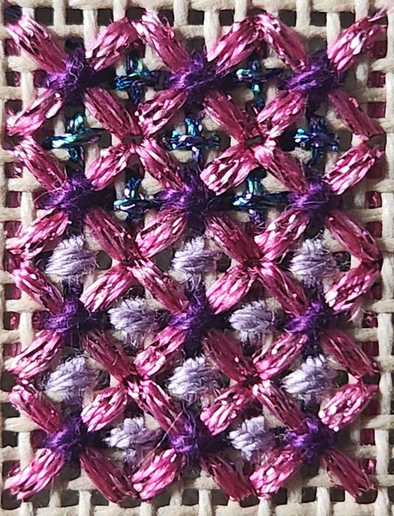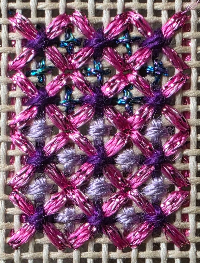 In this stitch sample, I used a pink Neon Rays+ as Step 1 for the large cross. For Step 2, I used dark purple DMC Perle #8 over the Neon Rays+ intersections. Then, on the top half, I filled in with blue and purple Kreinik Braid #8 which added too many colors, too much sparkle and left exposed canvas. If this was a painted canvas, exposed canvas might look better. On the bottom half, I used 4 strands of Splendor in a light purple. So, using 2 purples looks better to me. And, there is less exposed canvas which looks better too. Zooming in on the stitching shows more canvas than looking at it at a normal distance.