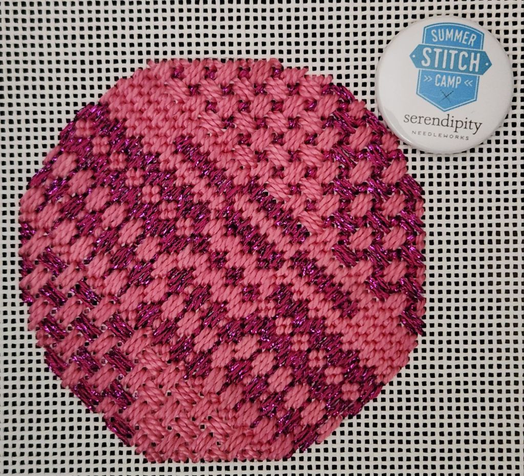 Here’s a second coaster that is square to eliminate compensation using 6 stitches from Ellen Johnson’s Summer Stitch Camp. With this, I have completed 4 of the 6 badges!
