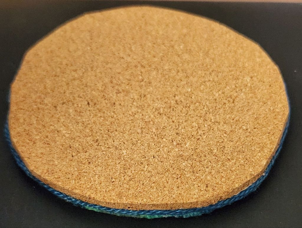 I found a roll of 1/8″ thick Cork Liner with adhesive backing (where else but Amazon). I used Ultrasuede for the first 2 coasters, and they are doing well, but I think cork is going to be better. Now, I have 2 rolls of cork. That’s got to be a lifetime supply!