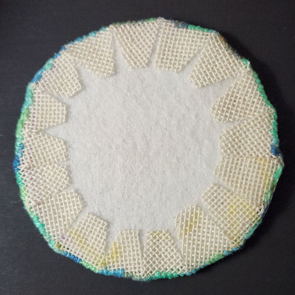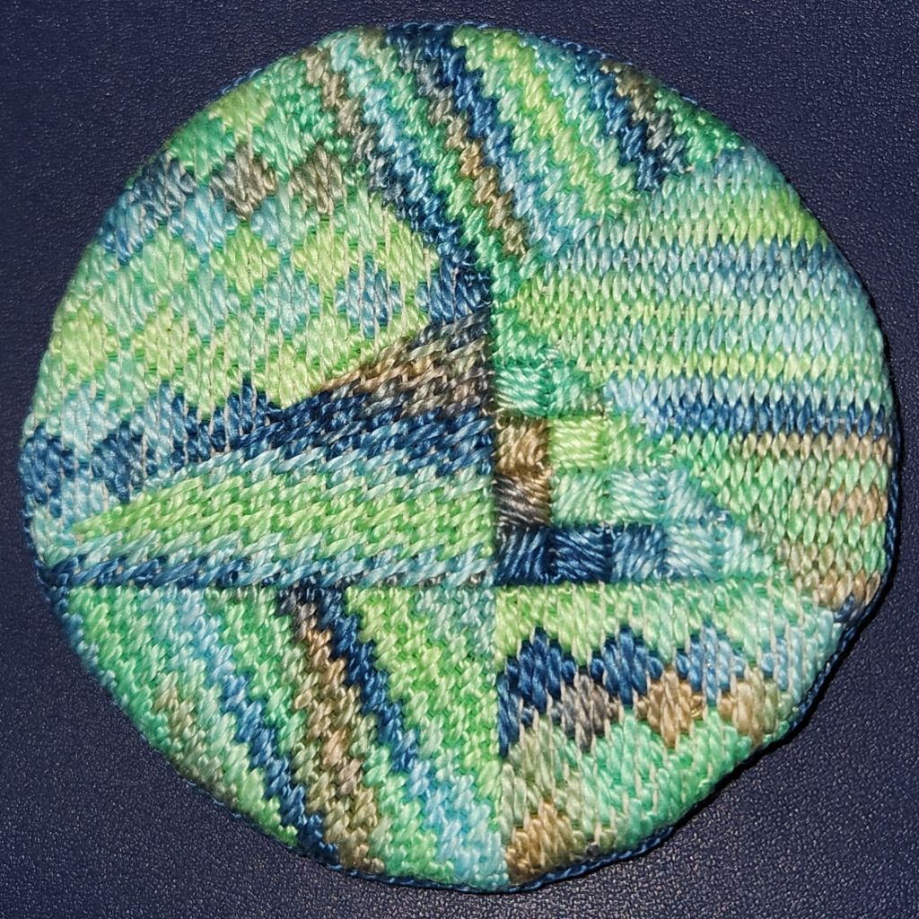 Here’s a second coaster that is square to eliminate compensation using 6 stitches from Ellen Johnson’s Summer Stitch Camp. With this, I have completed 4 of the 6 badges!