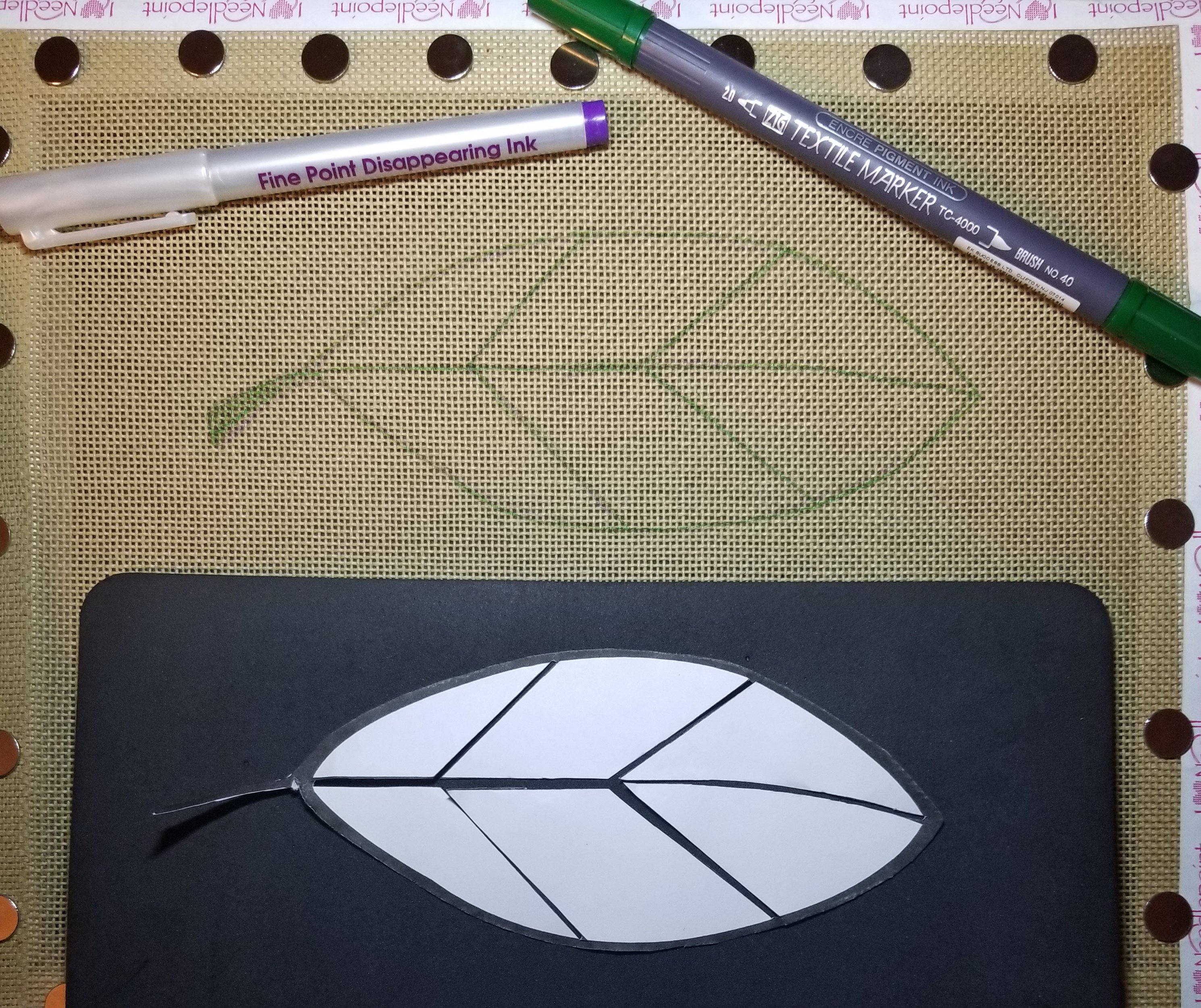 Access Commodities has an instructional booklet on their website to go with the kit. The kit contains Trebizond TRA734, Soie d’Alger 2125, Soie de Paris SDP2125, Soie Gobelins SGS2125, Au Ver A Soie 100/3 SMS325, and Soie Perlee SPS325. Threads are all green. First, I made the outline using my “Purple Pen” with disappearing ink. I had carefully cut out the stem and the veins from a paper copy and used it like a stencil. That looked good. So, I used my ZIG Fabricolor green marker that I got in a previous class. Easy! The threads are green and I’ll be sure to cover the lines anyway.
