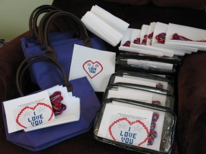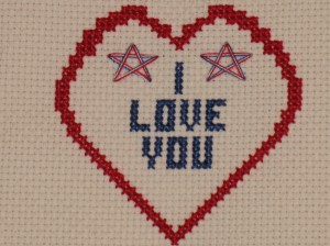 The “kissing pillows” are small (4” x 4”) cross-stitched pillows that say “I LOVE YOU” with two red, white, & blue stars within a larger red heart. They work up quickly (2-3 hours). Once we have enough stitched, we’ll back them with fabrics in patriotic designs & stuff them.