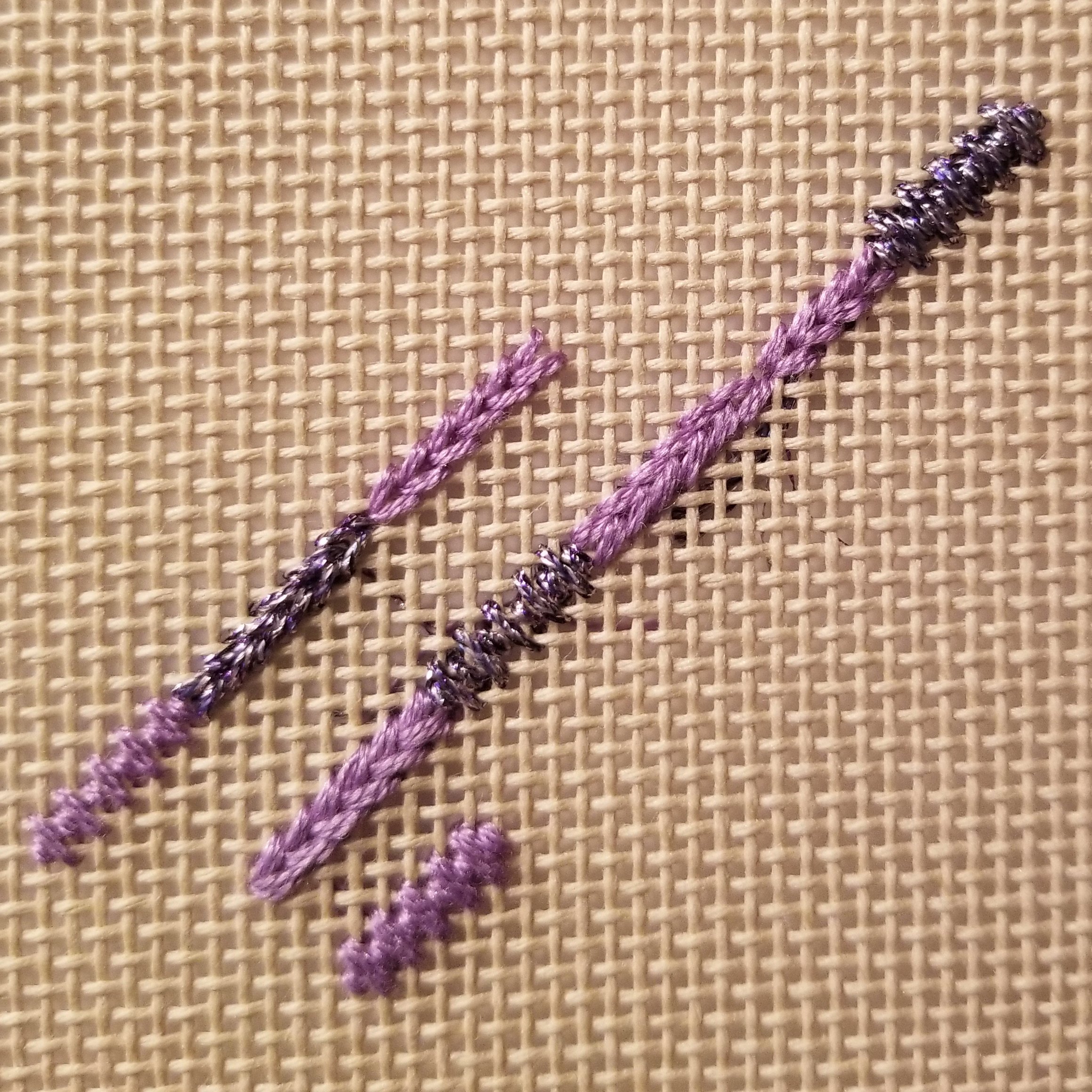 Most of the stitches worked up well except for the Nobuko Stitch (green thread under the purple beads). They seemed to blend together too much. So, I made fewer of them.