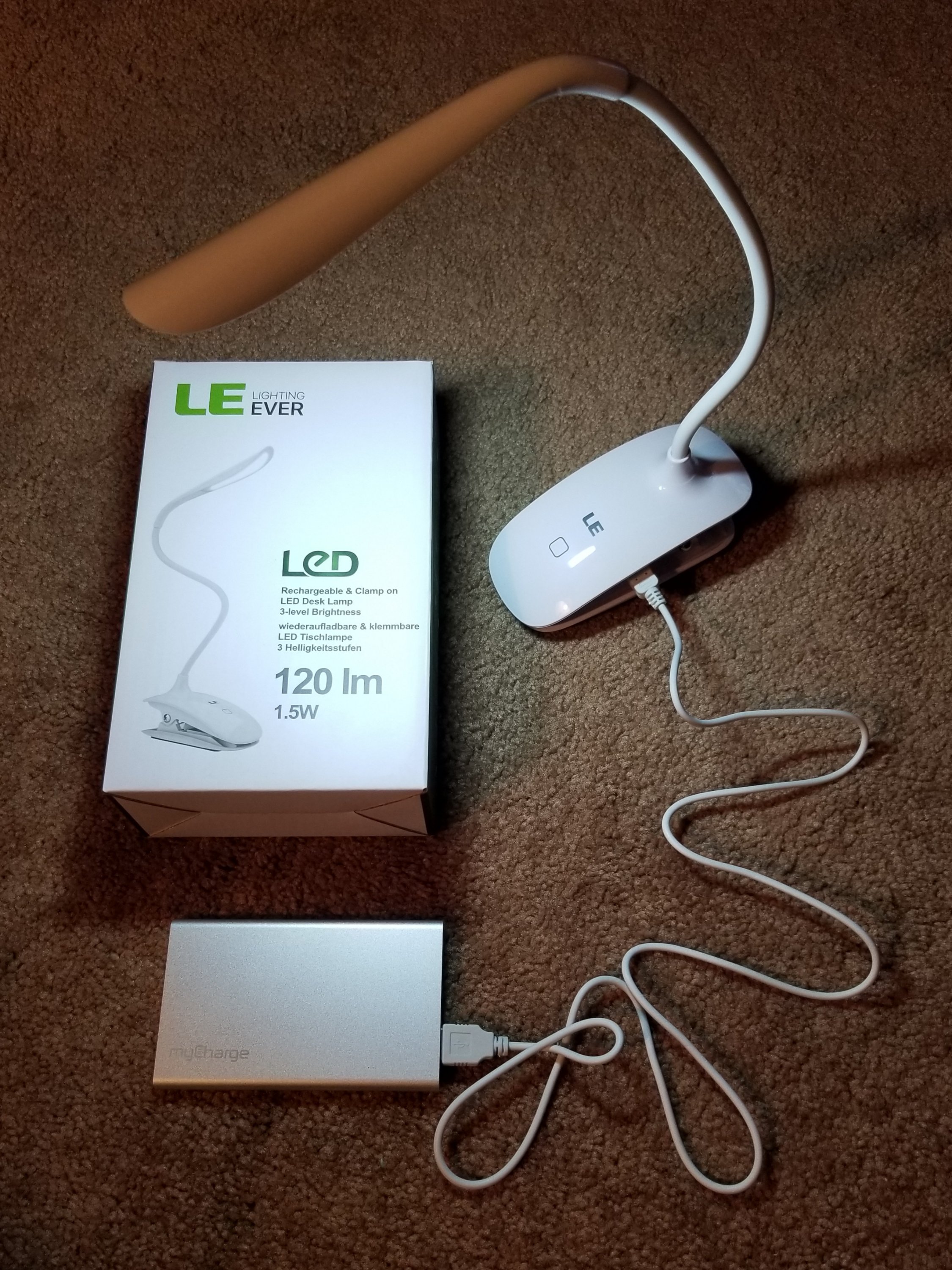 We can’t bring plug in lights to ANG Seminars starting with Washington later this year. Because it only lasts 4.5 hours, it wouldn’t last a full day class. So, I’ll use the charger we bought for phone emergencies on trips. We got myCharge and a USB cable (sold separately) for approximately $25. In Amazon, search “myCharge RazorPlus 3000mAh Portable Charger With USB Port“. The USB cord that came with the light is compatible with the charger.