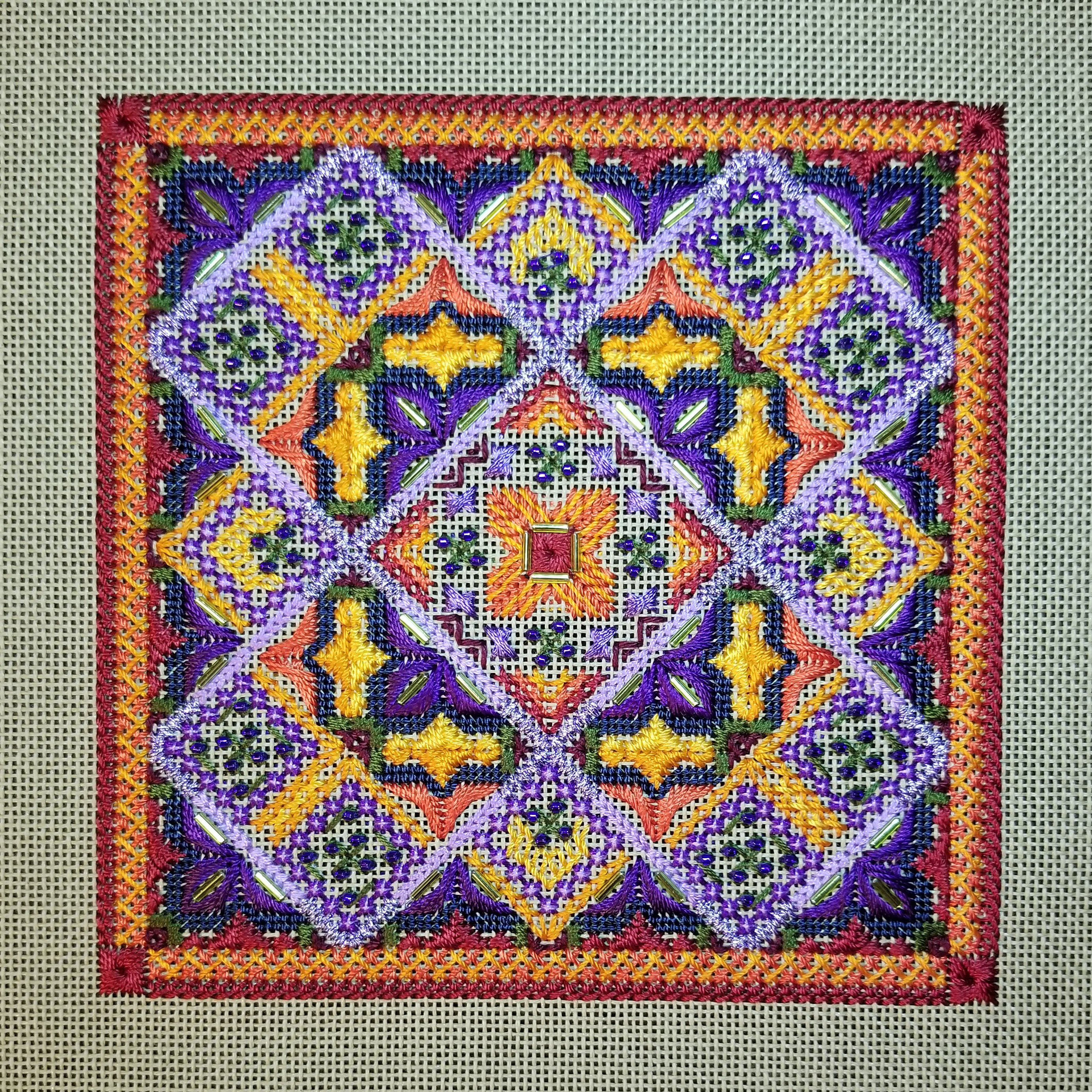 So, it took me all night but I’m doing a single motif in the Needlepoint Inc SilkLeaf Green Range 256 (bottom row right). The double motif seems blobby still (center bottom below the red/oranges. You can see the single clearly. However, I need new beads. I wish I had know this while I was at Edwardian Needle. Oh well! Beads will go on last. I’ll figure that out later. I could always do French Knots. It’s been an interesting learning experience to see how slightly different threads appear differently. No wonder Orna says she rips a lot out as she designs.